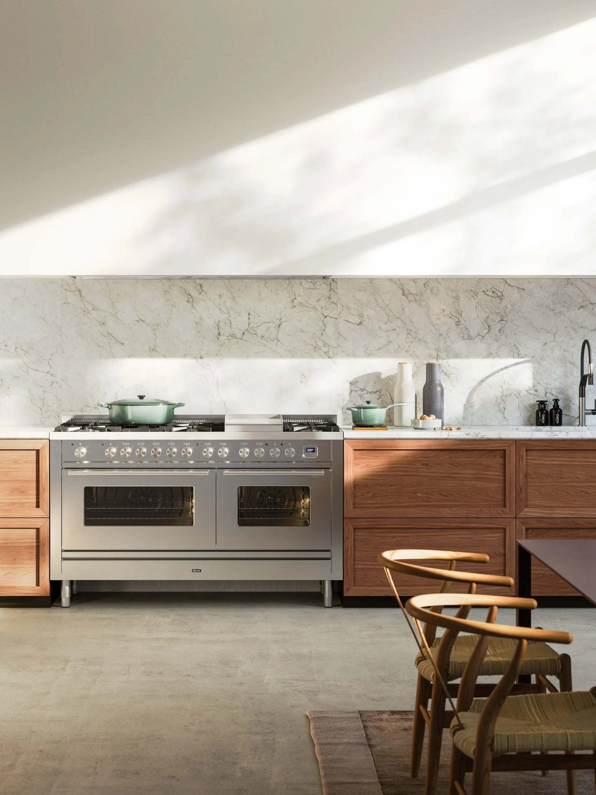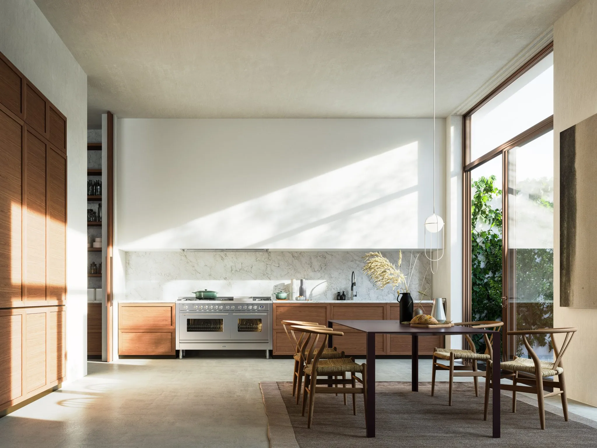 Functionality and performance are also at the forefront in the choice of appliances. Ilve’s 150 cm Professional Plus range cooker is designed for demanding cooks looking for the highest level of professionalism even at home: equipped with a fry-top and multifunctional double oven (15 functions and 300°C maximum temperature), it is sturdy and ergonomic, perfect to fit easily into any setting. The built-in IAG hood disappears above the hob, leaving the starring role to technology: maximum power of 355 W, class A and 890 m3/h extraction.