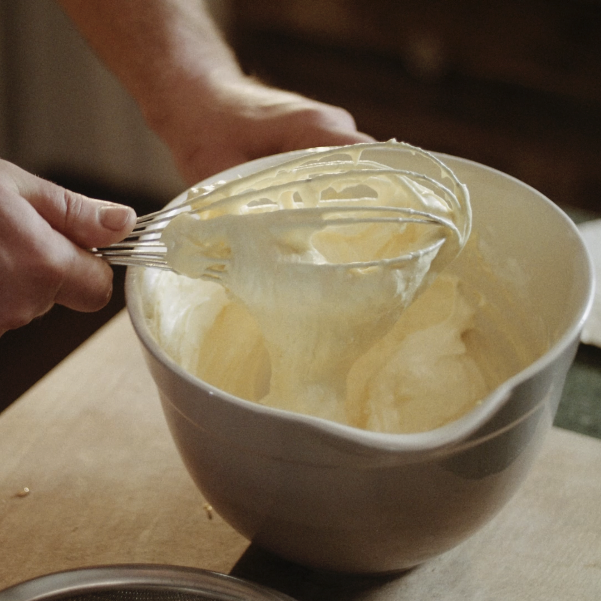 Gently add the mascarpone cheese to this mixture in several steps, then add the whites whipped stiff. Let the cream rest in the fridge for at least 30 minutes before beating it stiff.